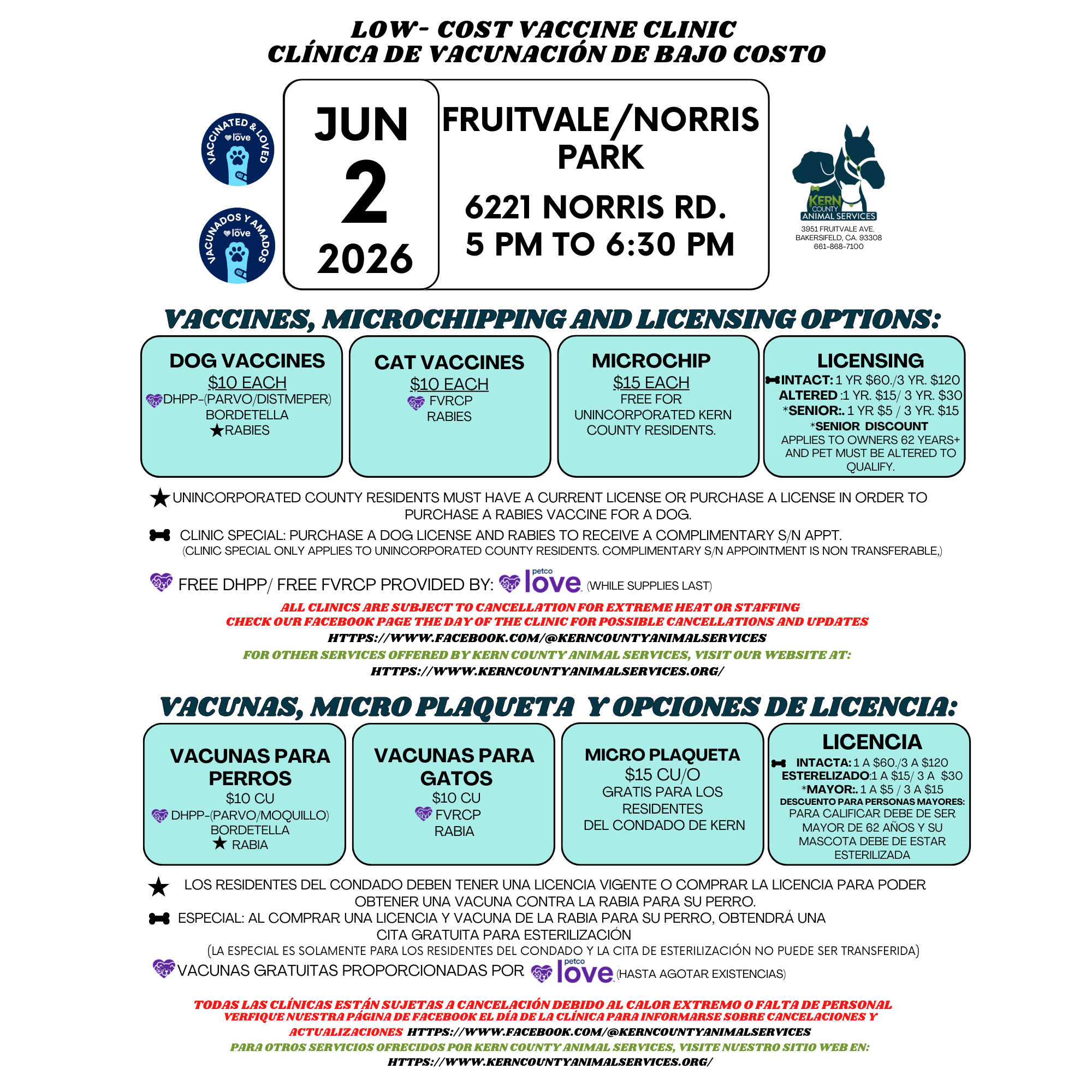 🐾 Low‑Cost Pet Vaccine Clinic — February 3, 2026 02/03/26 to 02/03/26 📍 Location: Fruitvale / Norris Park ⏰ Time: 5:00 PM – 6:30 PM No appointment needed — just stop by! It’s first come, first served, so arriving early is your best bet. ✨ What We Offer: • Affordable dog and cat vaccinations • Low‑cost microchipping to help keep your pets safe 📌 Important: • Vaccinations are only available at our scheduled vaccine clinics. • Cats must be in carriers • Dogs must be on a leash • Puppies that are not fully vaccinated should not be walked in the park 📞 Questions? Call 661‑868‑7146 Tap the title to view full details and pricing.