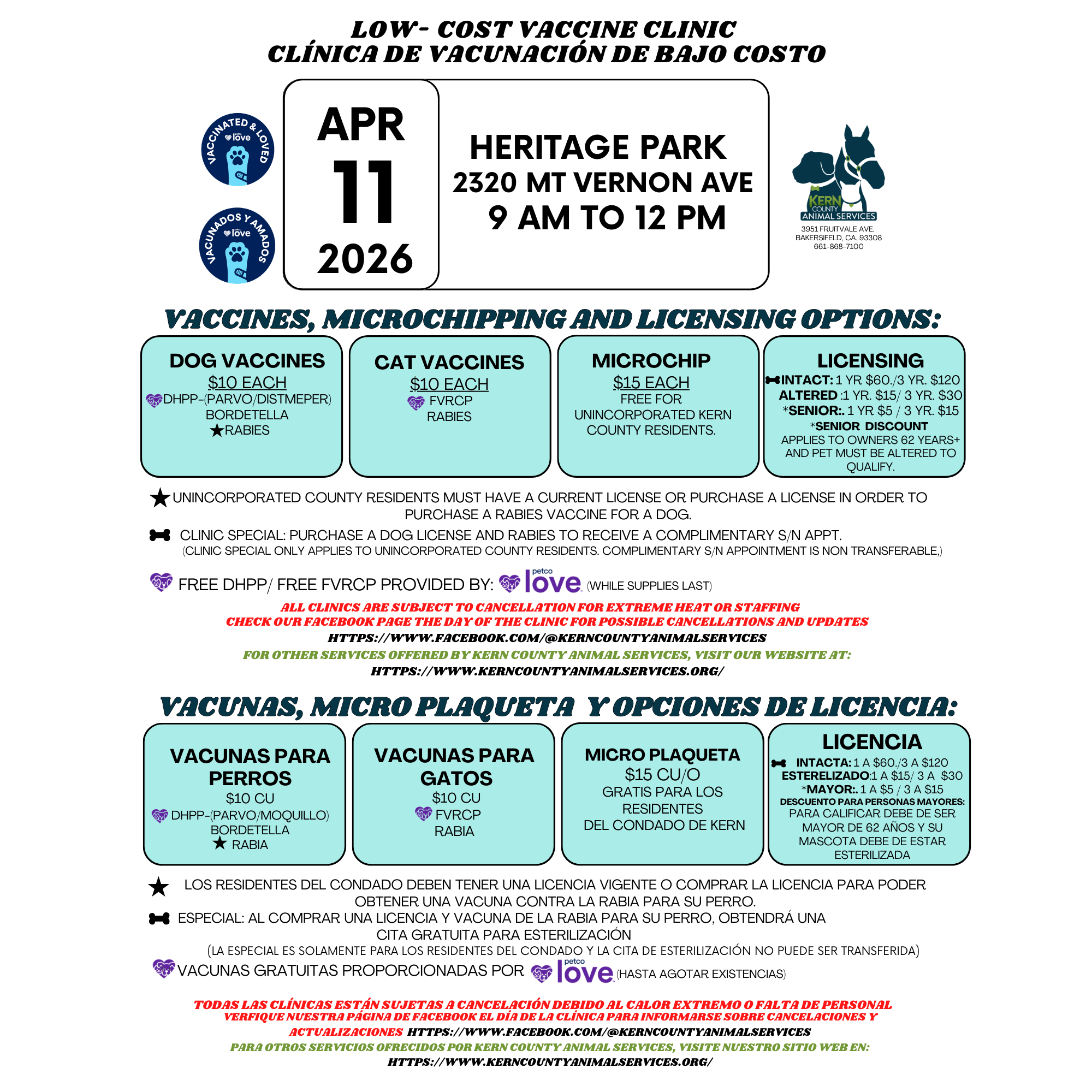 🐾 Low‑Cost Pet Vaccine Clinic — Las Palmas Park in Arvin 09/19/26 to 09/19/26 📍 Location: Las Palmas Park in Arvin ⏰ Time: 7 AM – 9:30 AM No appointment needed — just stop by! It’s first come, first served, so arriving early is your best bet. ✨ What We Offer: • Affordable dog and cat vaccinations • Low‑cost microchipping to help keep your pets safe 📌 Important: • Vaccinations are only available at our scheduled vaccine clinics. • Cats must be in carriers • Dogs must be on a leash