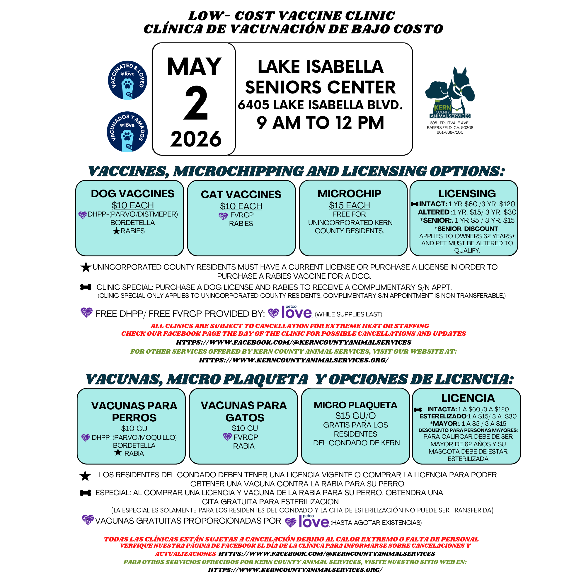 🐾 Low‑Cost Pet Vaccine Clinic — Lake Isabella 05/02/26 to 05/02/26 📍 Location: Lake Isabella Veterans/Seniors Center ⏰ Time: 9 AM – 12 PM No appointment needed — just stop by! It’s first come, first served, so arriving early is your best bet. ✨ What We Offer: • Affordable dog and cat vaccinations • Low‑cost microchipping to help keep your pets safe 📌 Important: • Vaccinations are only available at our scheduled vaccine clinics. • Cats must be in carriers • Dogs must be on a leash