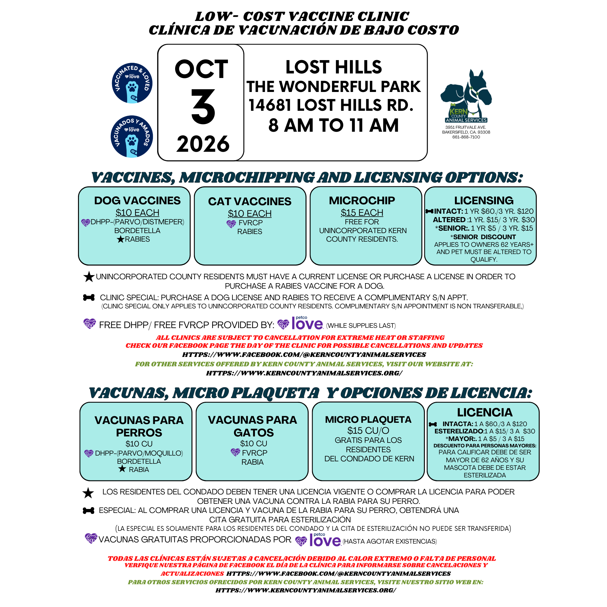🐾 Low‑Cost Pet Vaccine Clinic — The Wonderful Park Lost Hills 10/03/26 to 10/03/26 📍 Location: The Wonderful Park Lost Hills ⏰ Time: 8 AM – 11 AM No appointment needed — just stop by! It’s first come, first served, so arriving early is your best bet. ✨ What We Offer: • Affordable dog and cat vaccinations • Low‑cost microchipping to help keep your pets safe 📌 Important: • Vaccinations are only available at our scheduled vaccine clinics. • Cats must be in carriers • Dogs must be on a leash