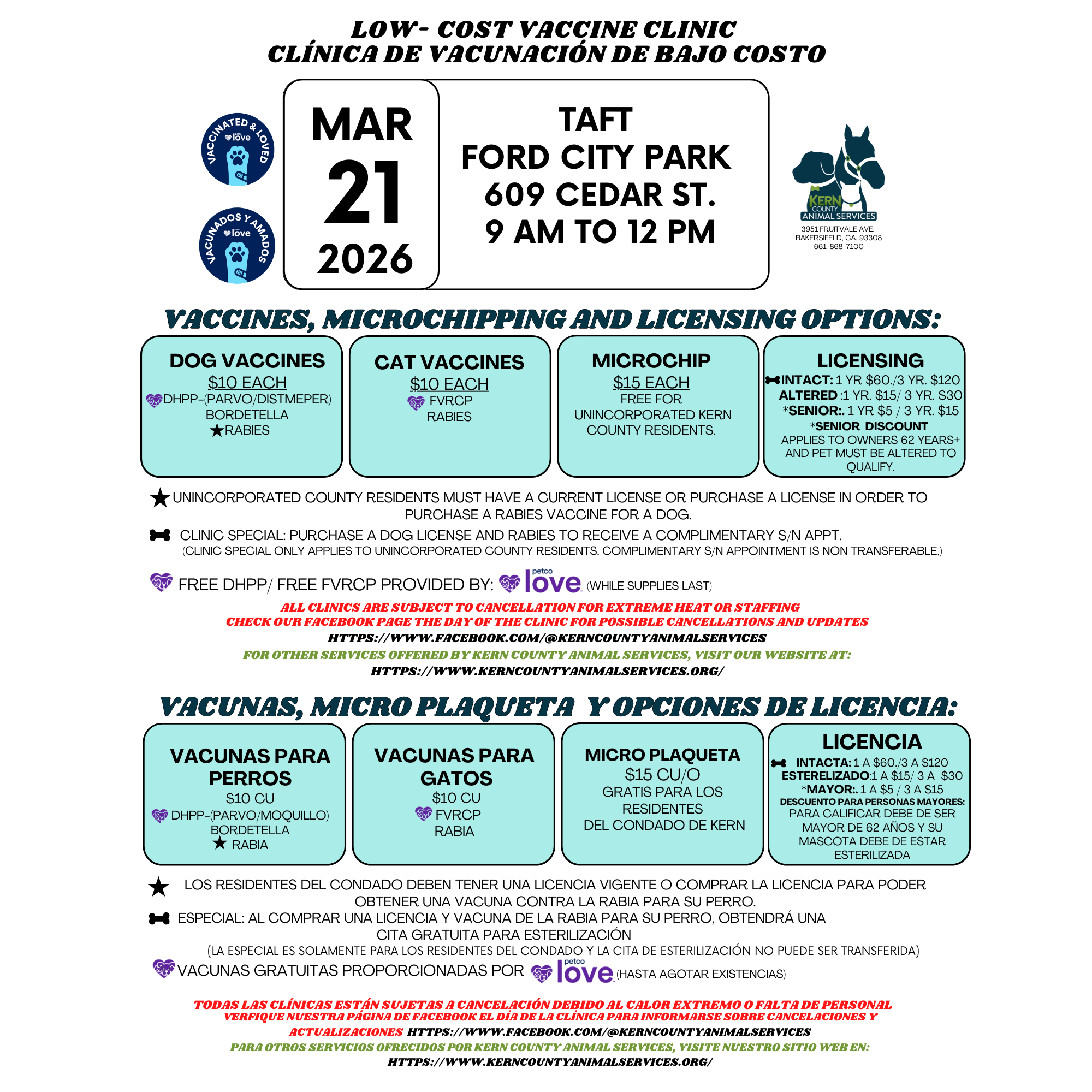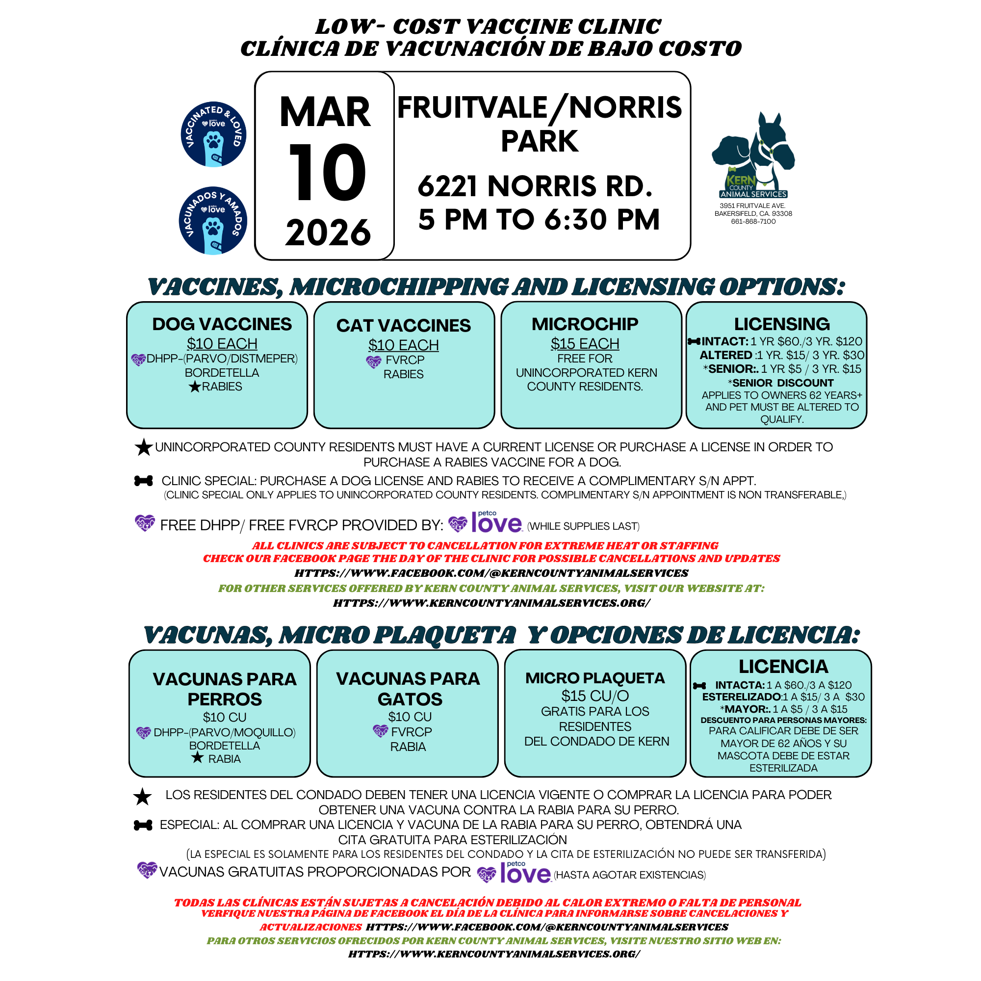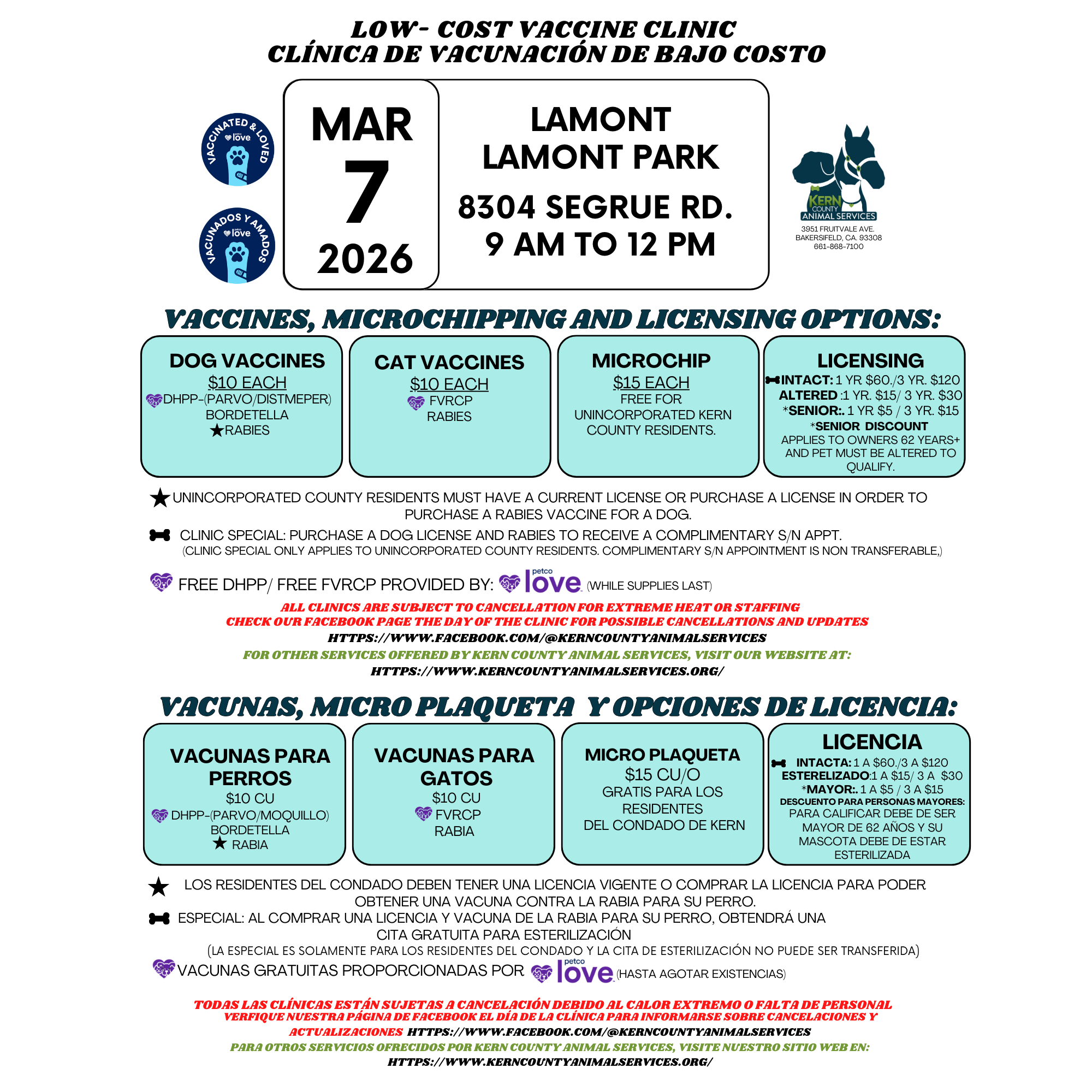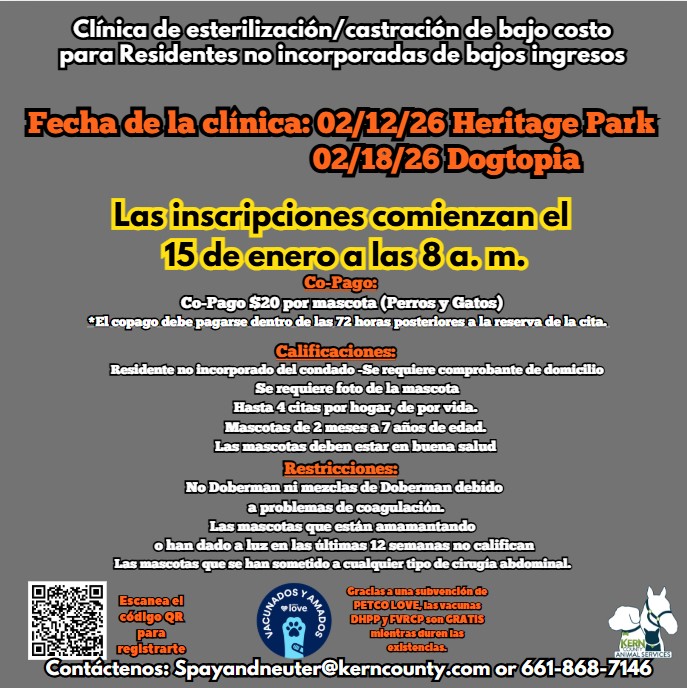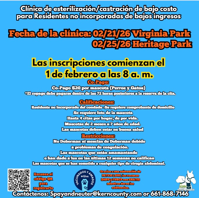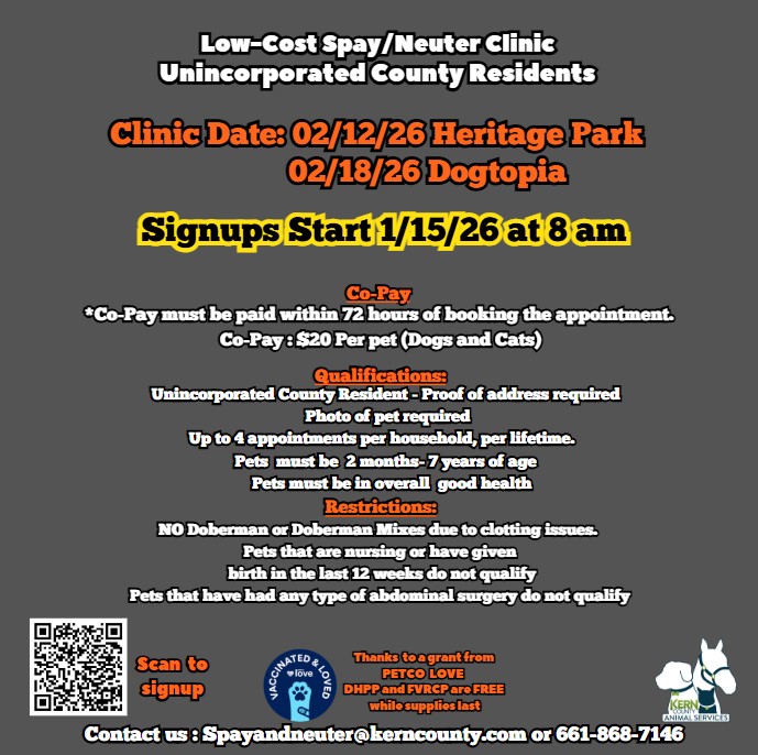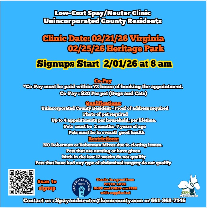 Kern County Animal Shelter - Bakersfield 3951 Fruitvale Avenue Bakersfield, CA 93308 Main Number: (661) 868-7100