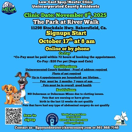 Saturday, November 8th at the Park at River Walk it's the annual Mega Adoption Event! Featuring adoptable pets from animal shelters and rescues from Bakersfield, Kern County, and beyond! Plenty of animal related businesses and services will be there too! If you love pets, this is the one event of the year you don't want to miss!