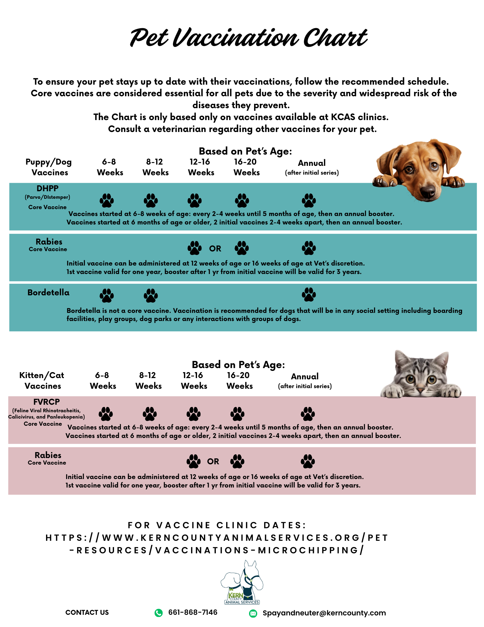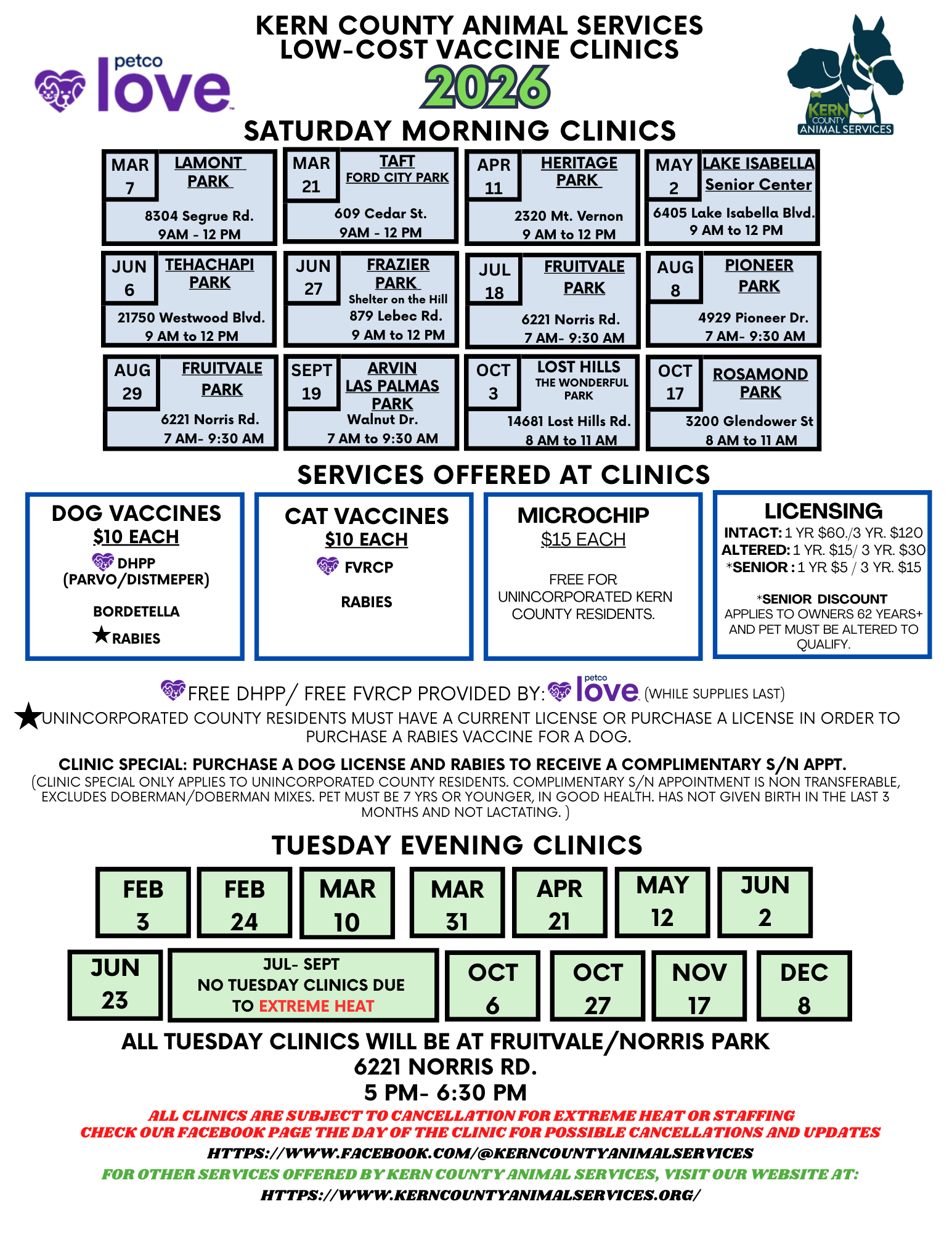 Kern County Animal Services also promotes vaccinations and microchipping by offering low-cost vaccinations and microchipping to all county residents, and animal licensing services to residents who live in the unincorporated areas of Kern County or in the contracted city of Tehachapi.