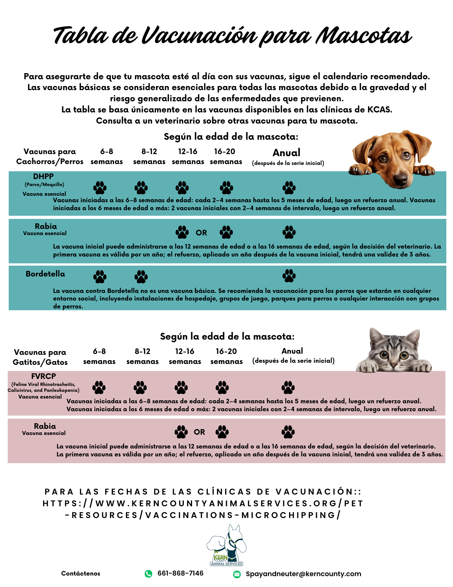 Vaccination calendar based on age of pet - Espanol - Los calendarios muestran la edad en que las mascotas deben ser vacunadas.